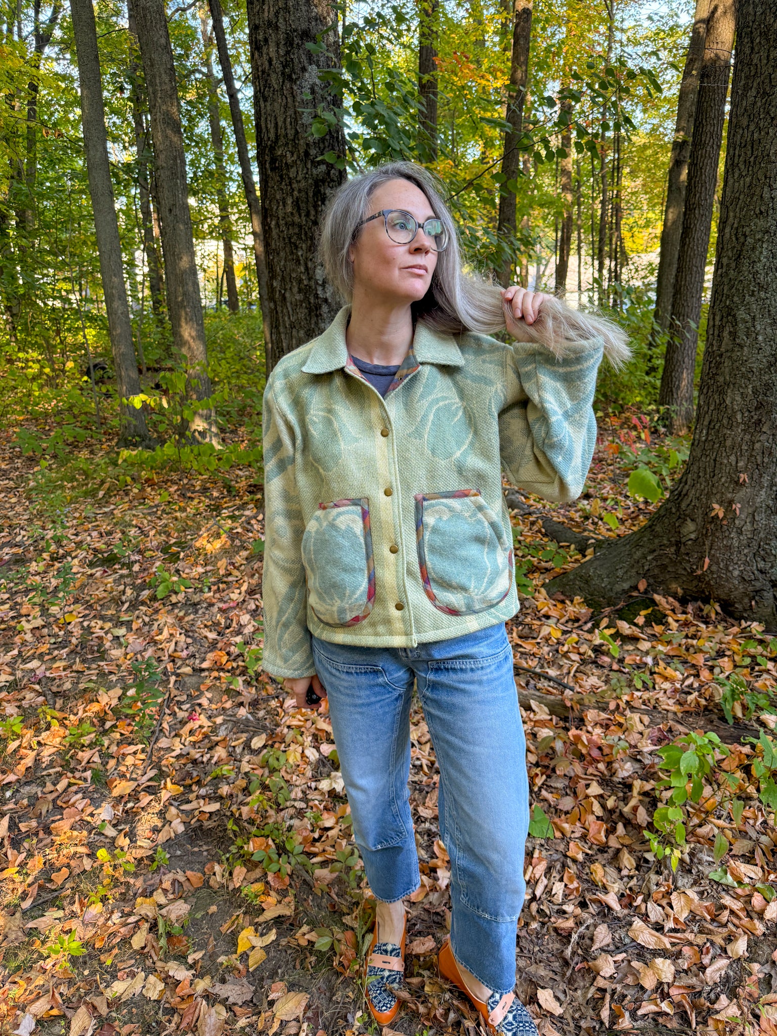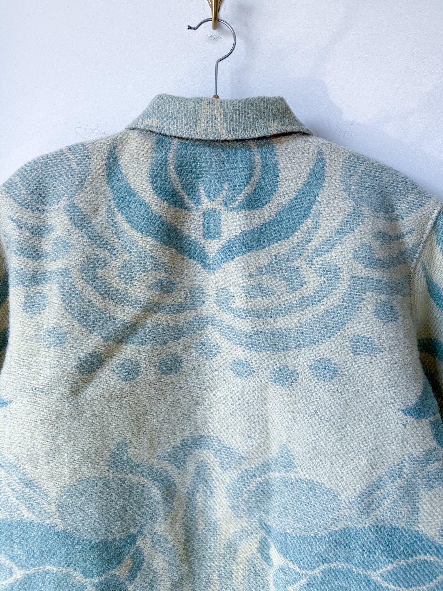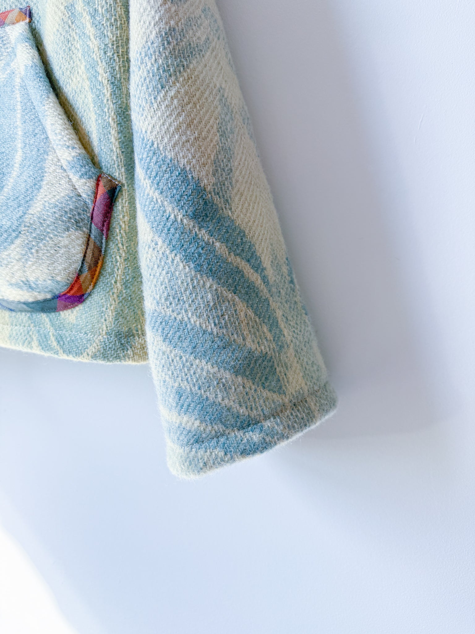 This vintage Golden Dawn 100% wool blanket has been reworked into a Chore Coat, which features a slight drop shoulder and tapered sleeve, with a less boxy silhouette (depending on how you would like it to fit), complete with rounded handwarmer style pockets and antique brass snaps. The inner facings, back of the neck, under-collar, and pockets feature a cotton plaid fabric (sent by our friends at Toad&Co!), and the original blanket’s tag has been reattached to the bottom corner of the piece.