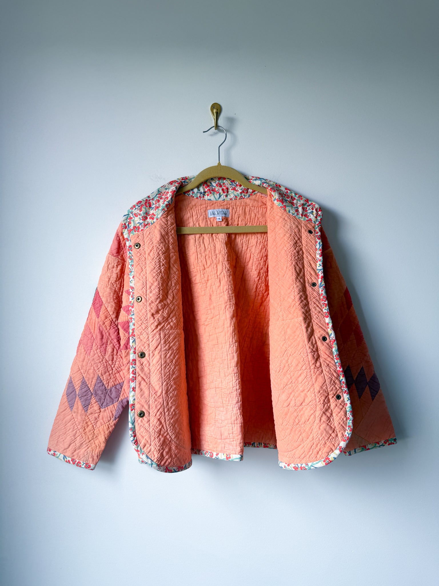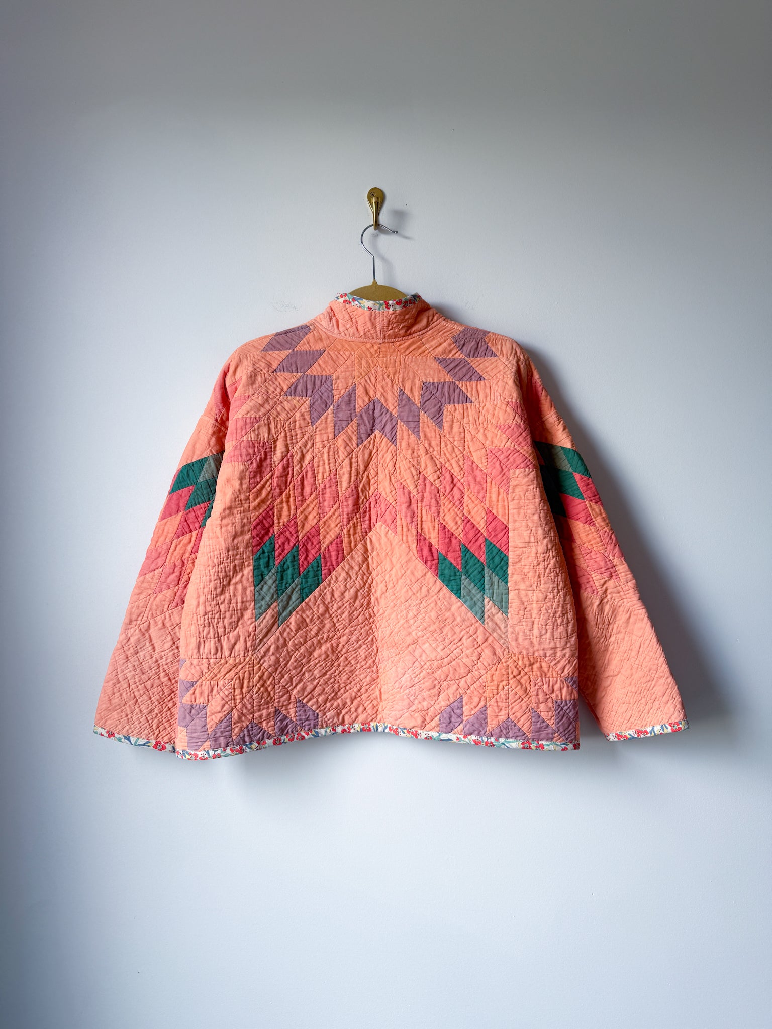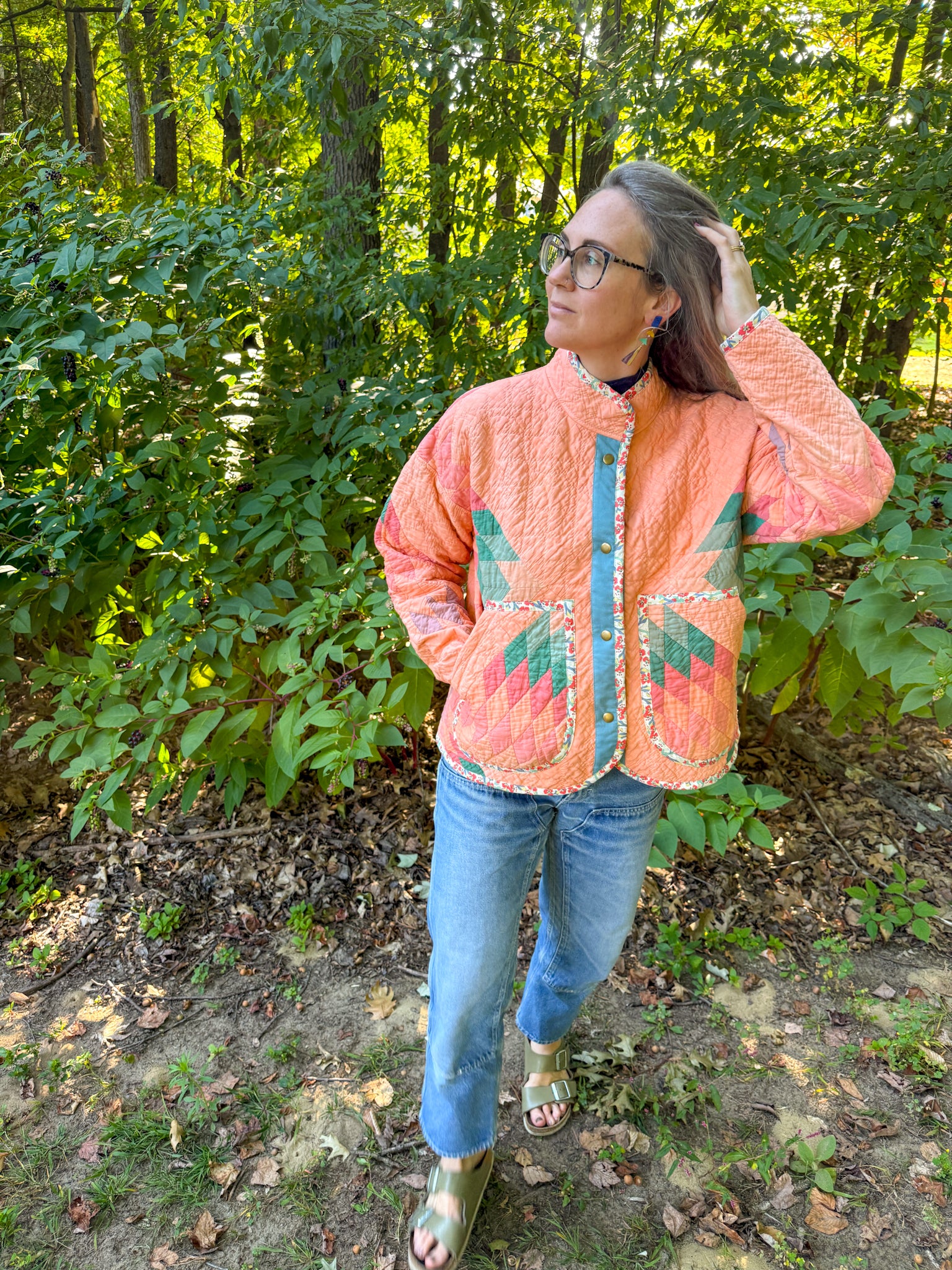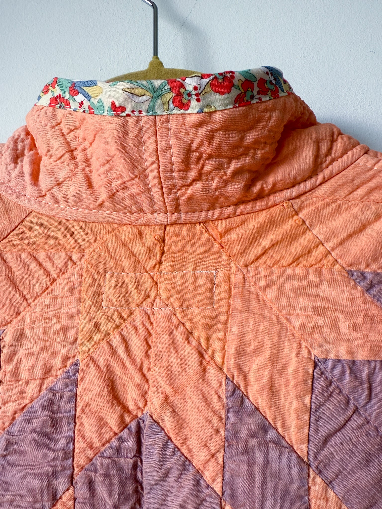This Flora Jacket is made from a lightweight quilt that was hand-pieced and quilted in a Broken Star pattern. This quilt came to me very well-loved, with lots of fading from the sun and being washed over its lifetime, but also had very prominent discoloration from being stored. I did my best to remove as much of the staining as possible though multiple soaks and drying in the sun, then ultimately decided she was the perfect candidate for being overdyed! It's safe to say she's even more beautiful in this peachy shade, further complimented by the floral cotton (fabric scraps gifted to me by my friend, Abby Huston) for the inner collar, as well as to bind the outer edges, pockets, and sleeves. The front plackets are constructed from an organic cotton twill fabric that was scrap fabric from a dress I altered into a skirt, and also overdyed to the most incredible blue.