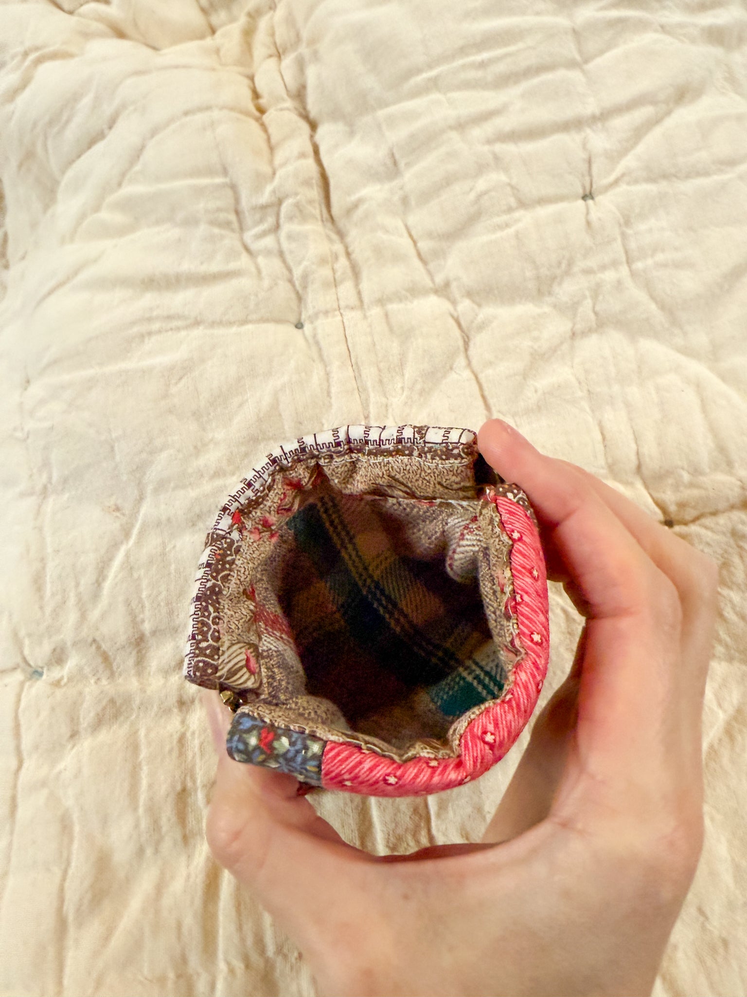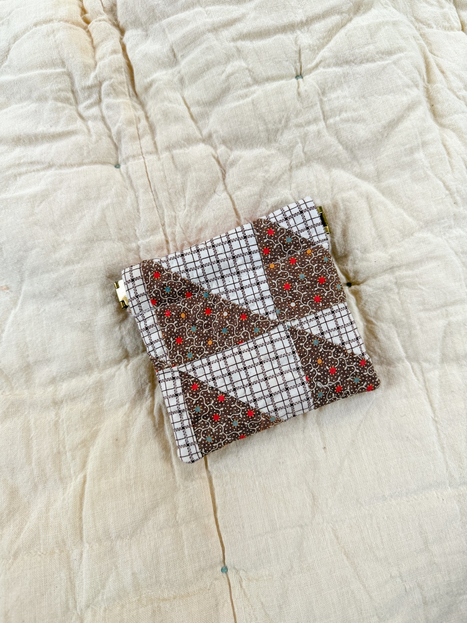 This quilted case is lined in vintage textile remnants (because nothing goes to waste around here!) and features a squeeze frame top to keep the contents securely stored without fear of falling out into the depths of your purse, backpack, glove compartment, coat, life, etc.
