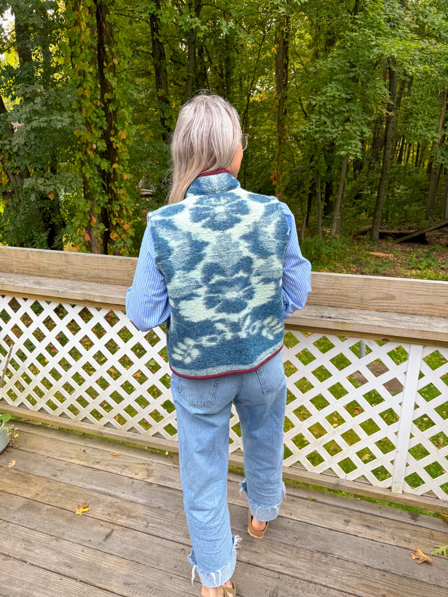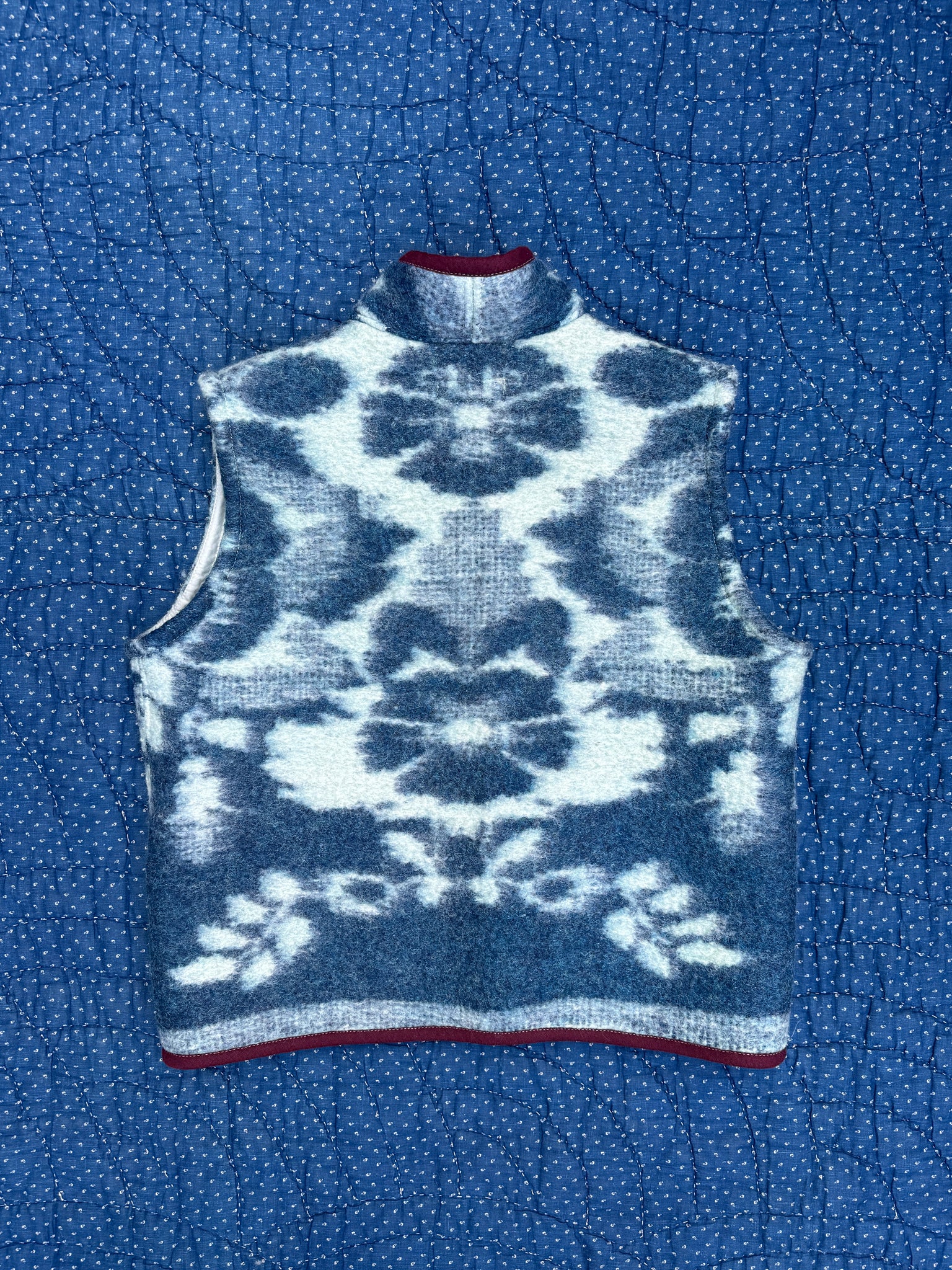 This vest features a vintage floral blanket, sourced from a woman-owned business in Ukraine. The outer edge and rounded patch pockets are bound in a rich red wine-toned cotton/linen blend, and the inner collar is lined in pale blue cotton shirting fabric from a salvaged men's dress shirt.