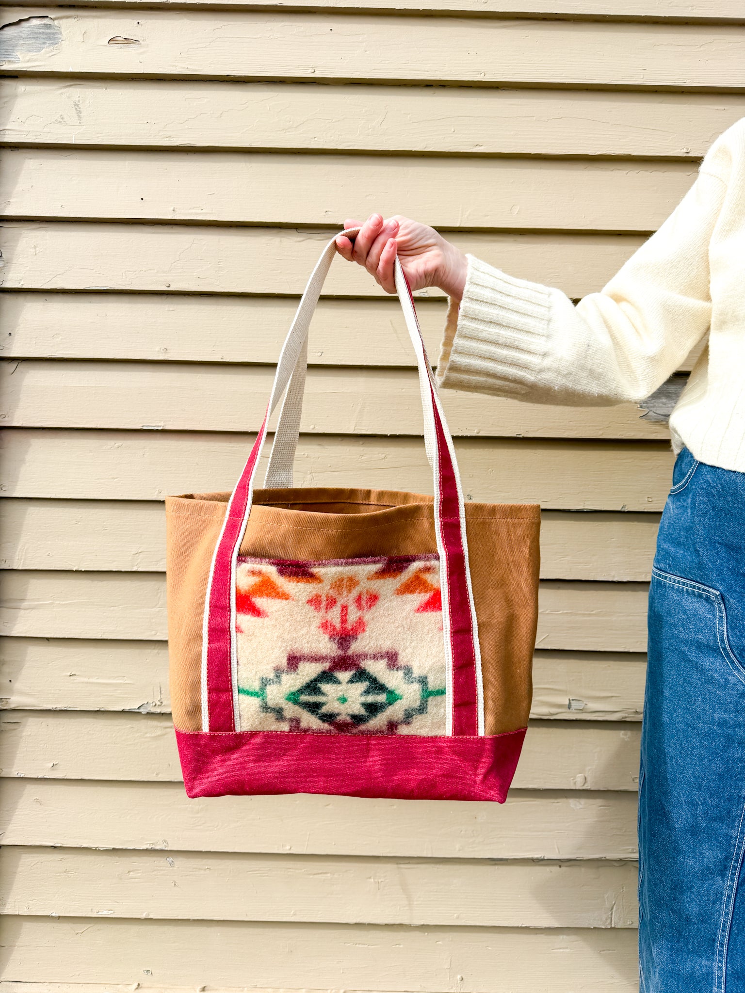 This bag features a canvas body in classic Carhartt brown, with a contrast, double layered bottom for durability in deep red waxed canvas, with an accent front pocket made from a vintage deadstock blanket purchased from a woman-owned business in Ukraine ((it has been batted and lined). The inside of the tote is unlined, and the top edge features an antique brass lobster clasp to keep your keys from wandering off.