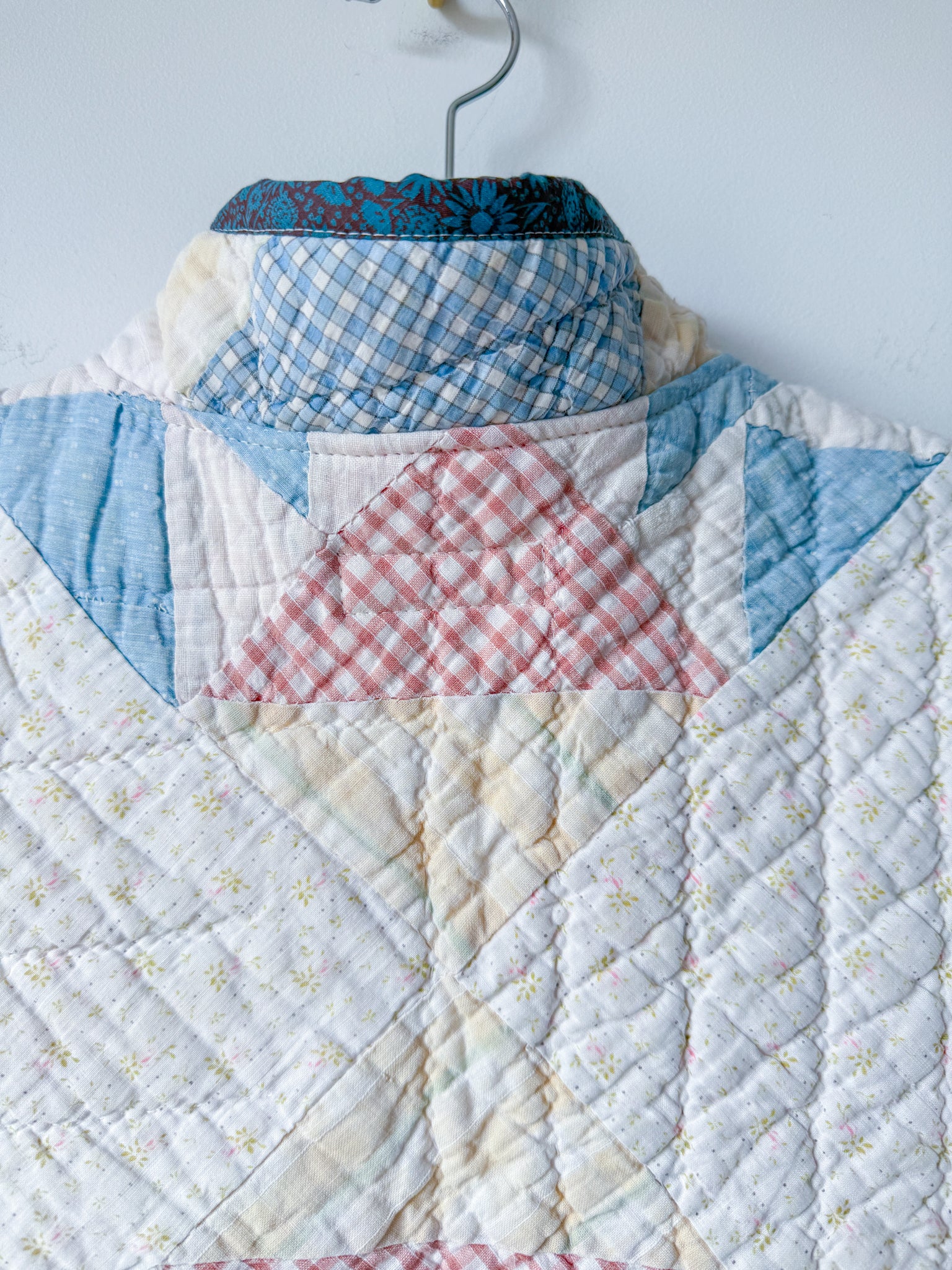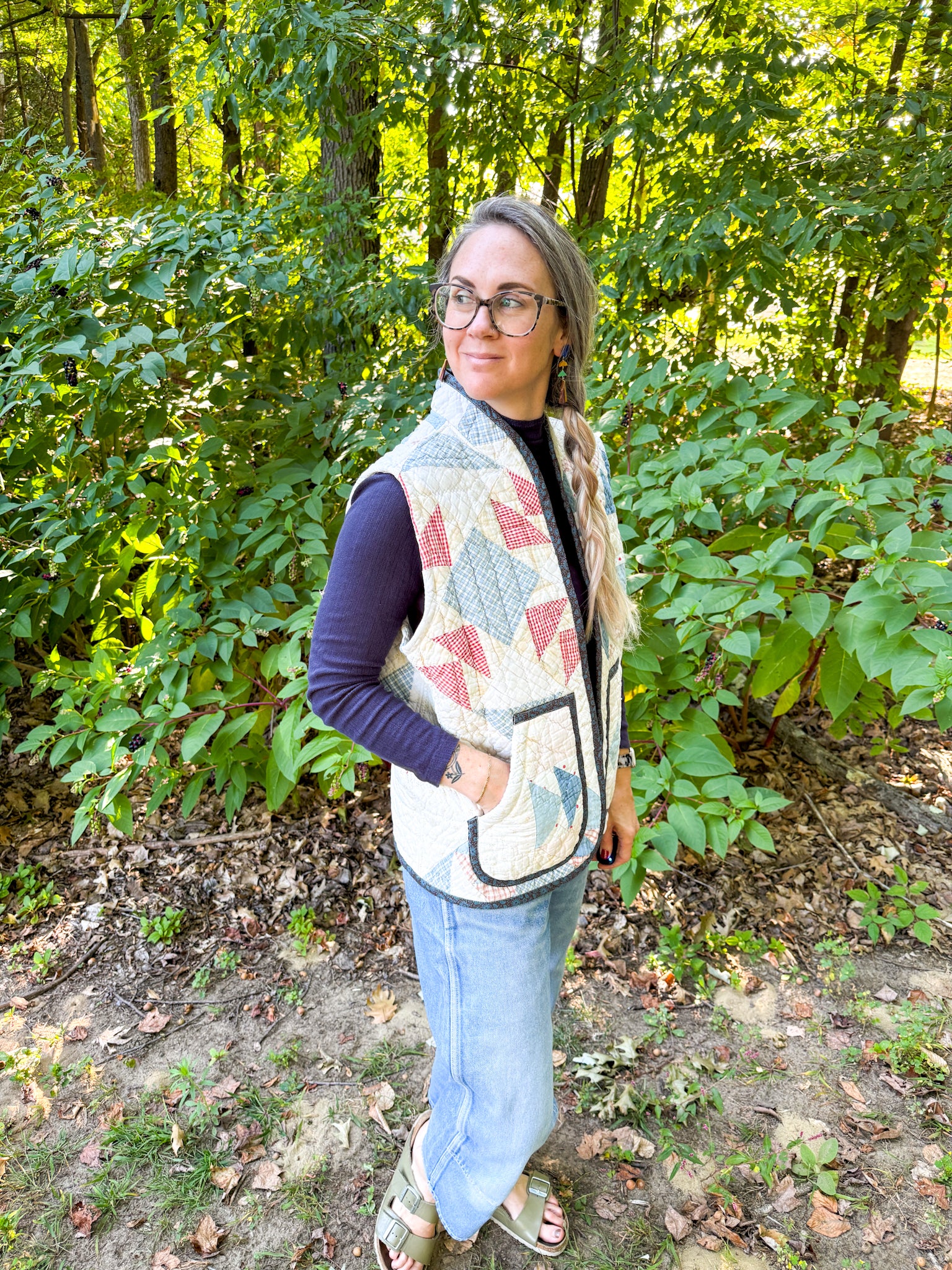 This vest is made from a midweight quilt that is densely batted; it is hand-pieced and quilted in a Stepping Stones pattern. The edges and pockets are bound in a rich chocolate brown and blue floral sample fabric from our friends at Toad&Co.