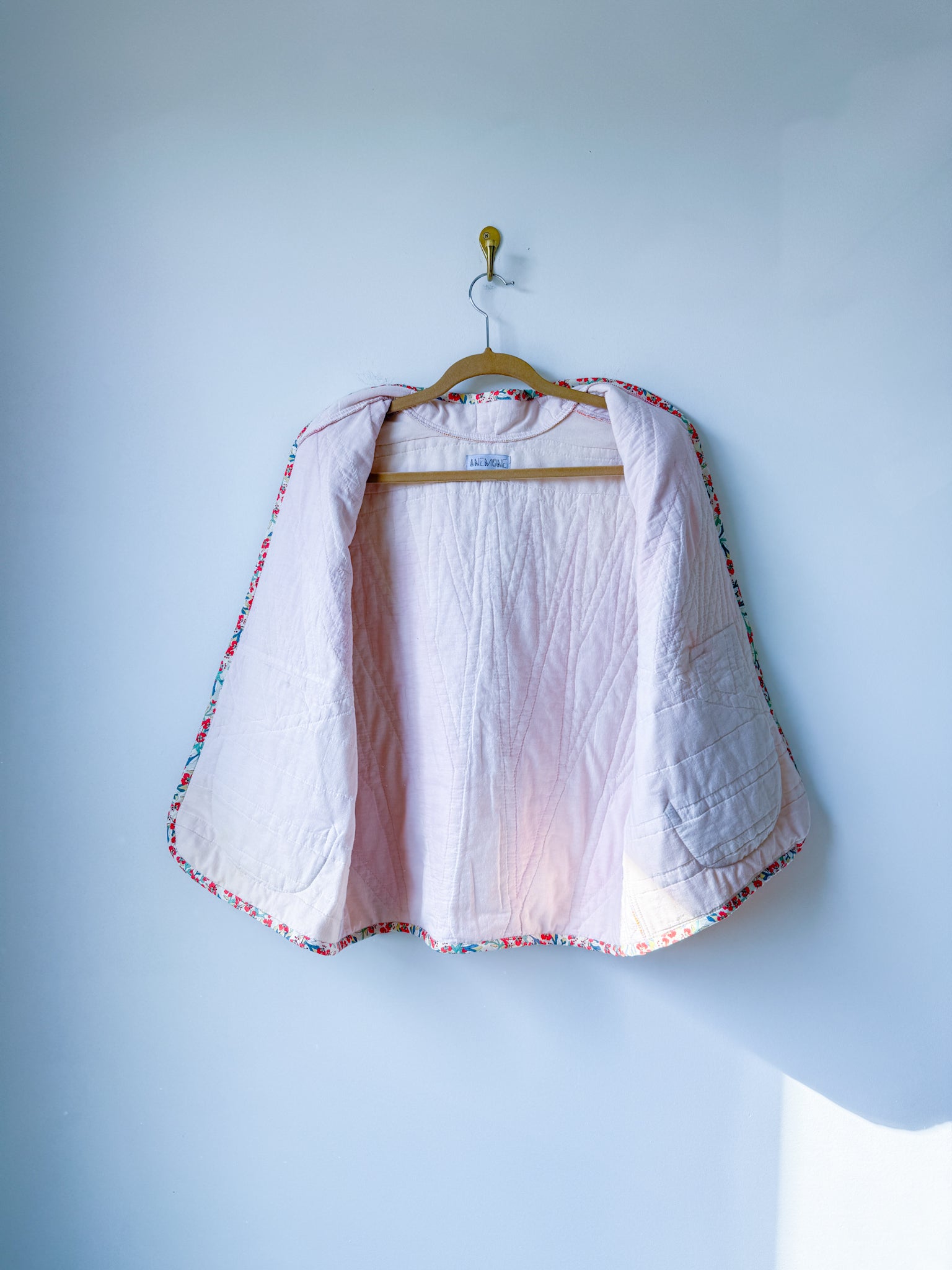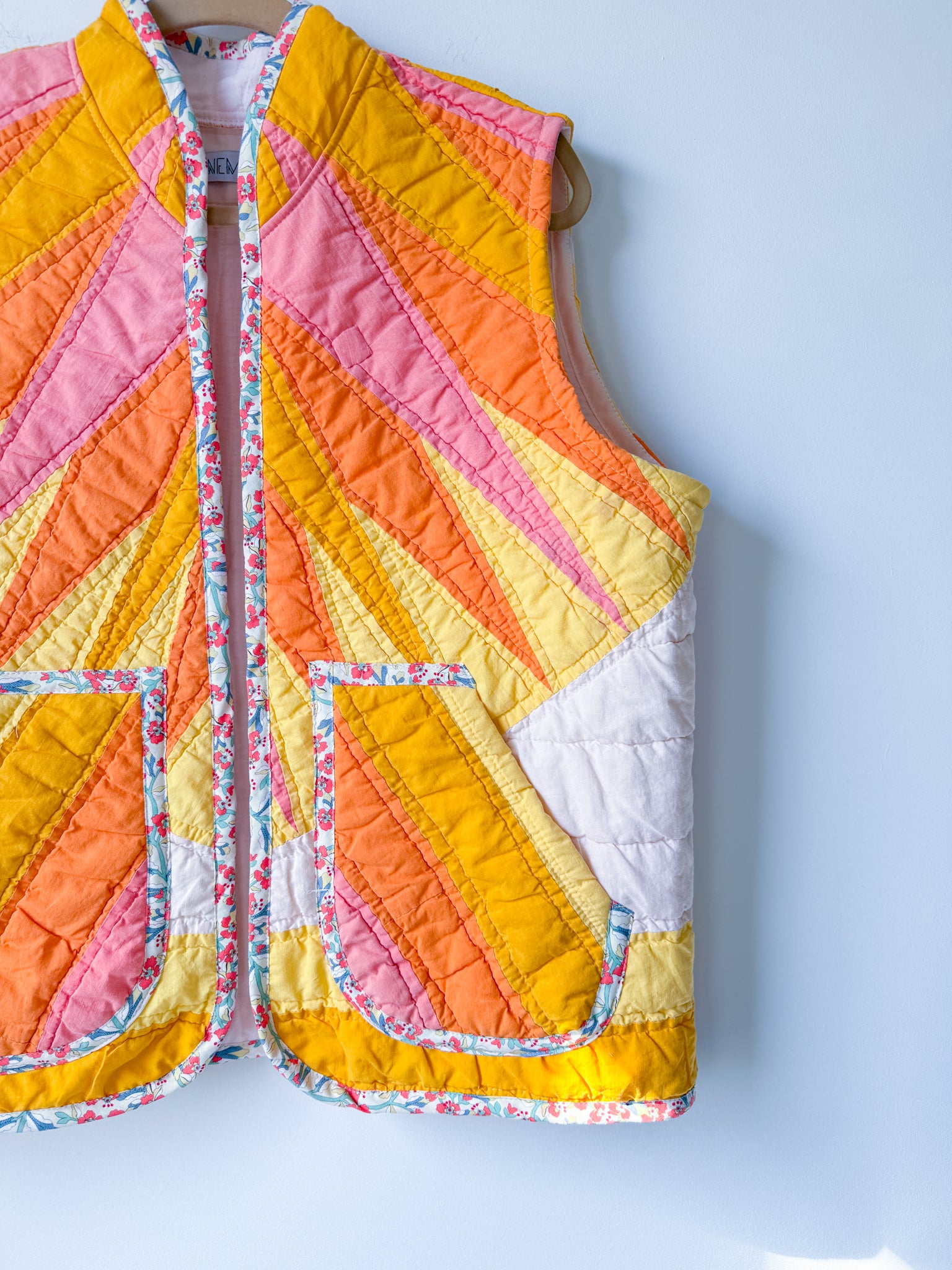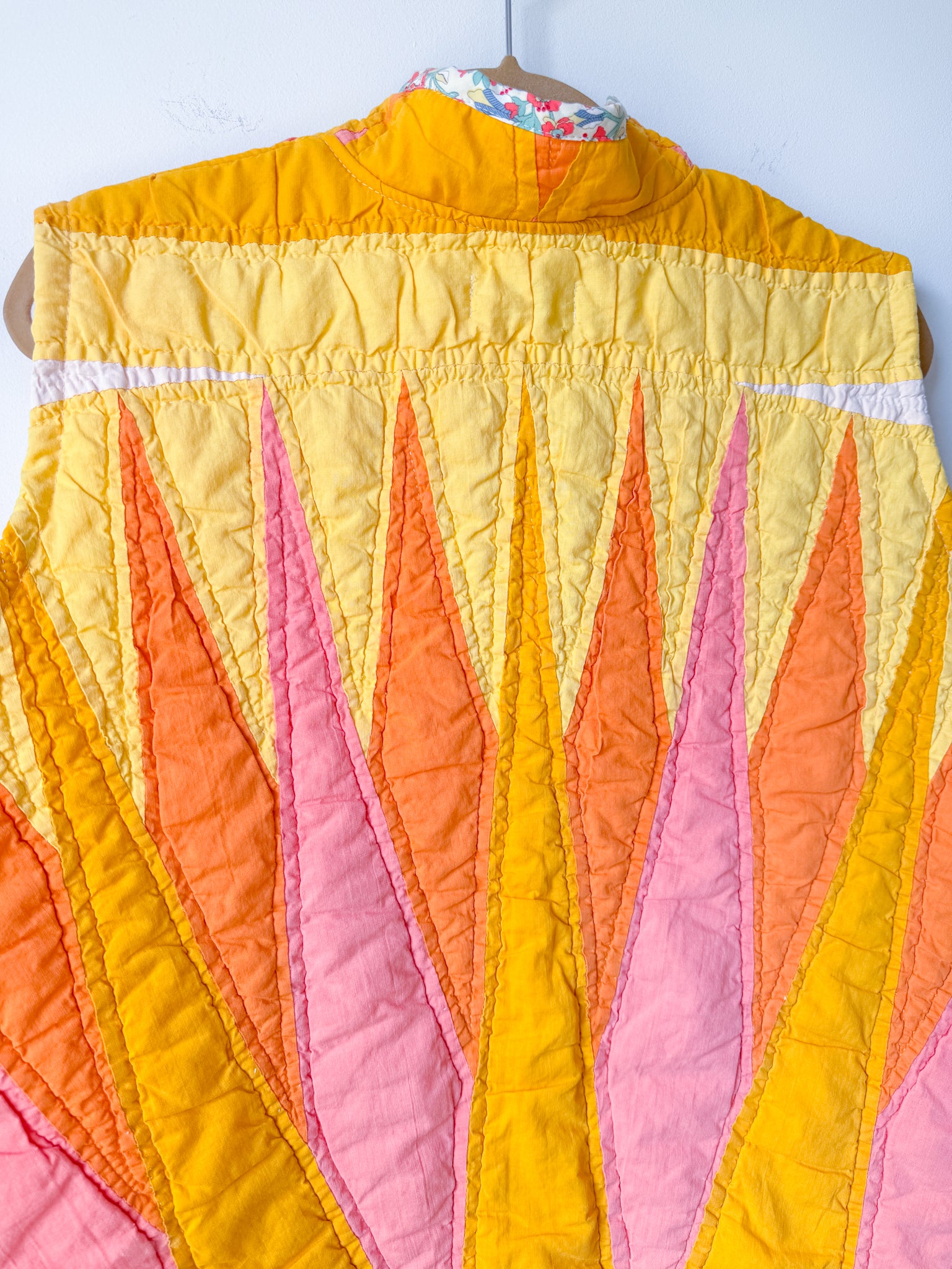 This vest is made from a lightweight quilt that is hand-pieced and quilted in a Sunburst pattern with coral pink, yellow, and orange cotton fabrics, and poly-fil batting. The outer edge and rounded patch front pockets are bound in a cheery floral cotton fabric.