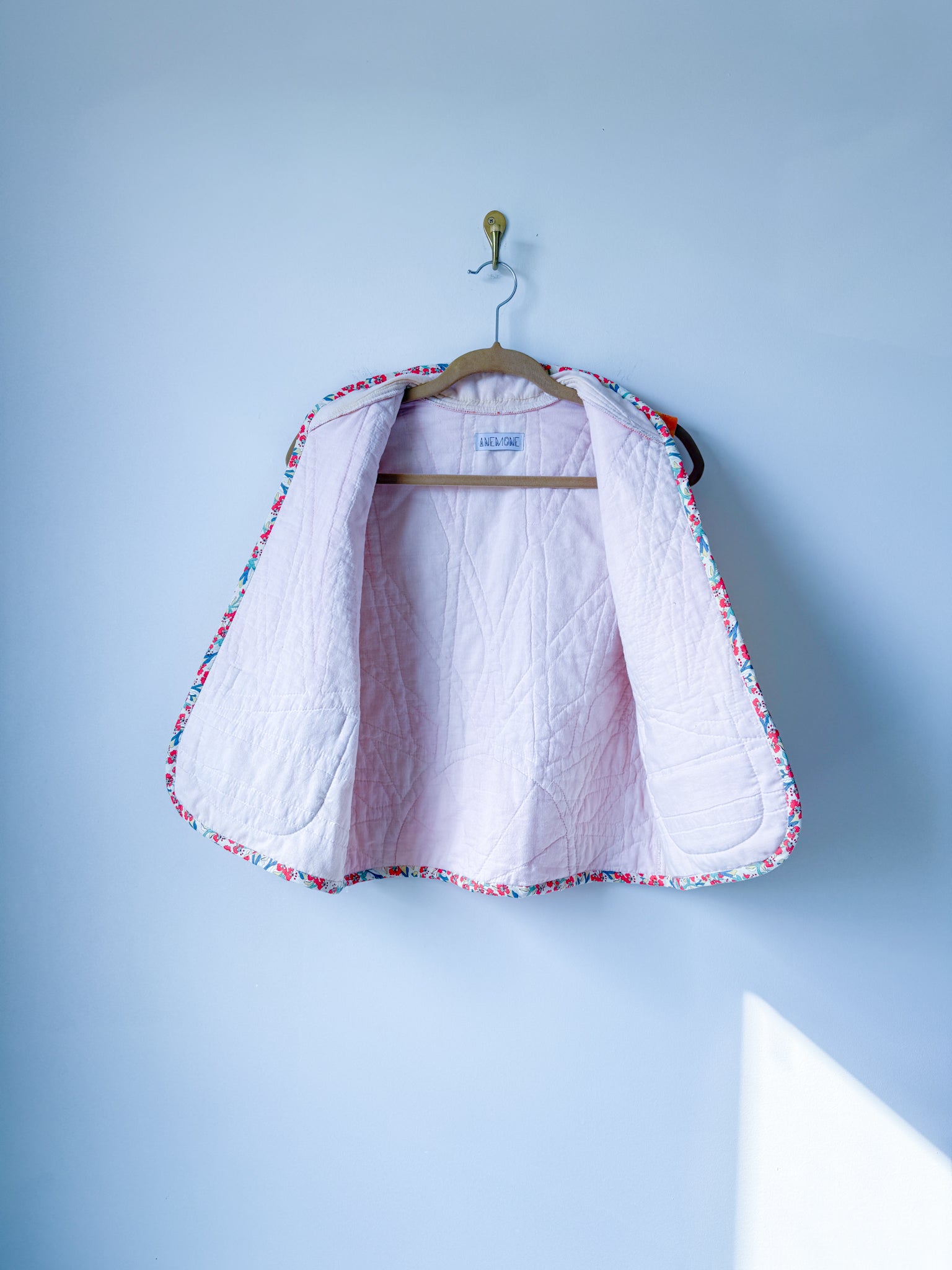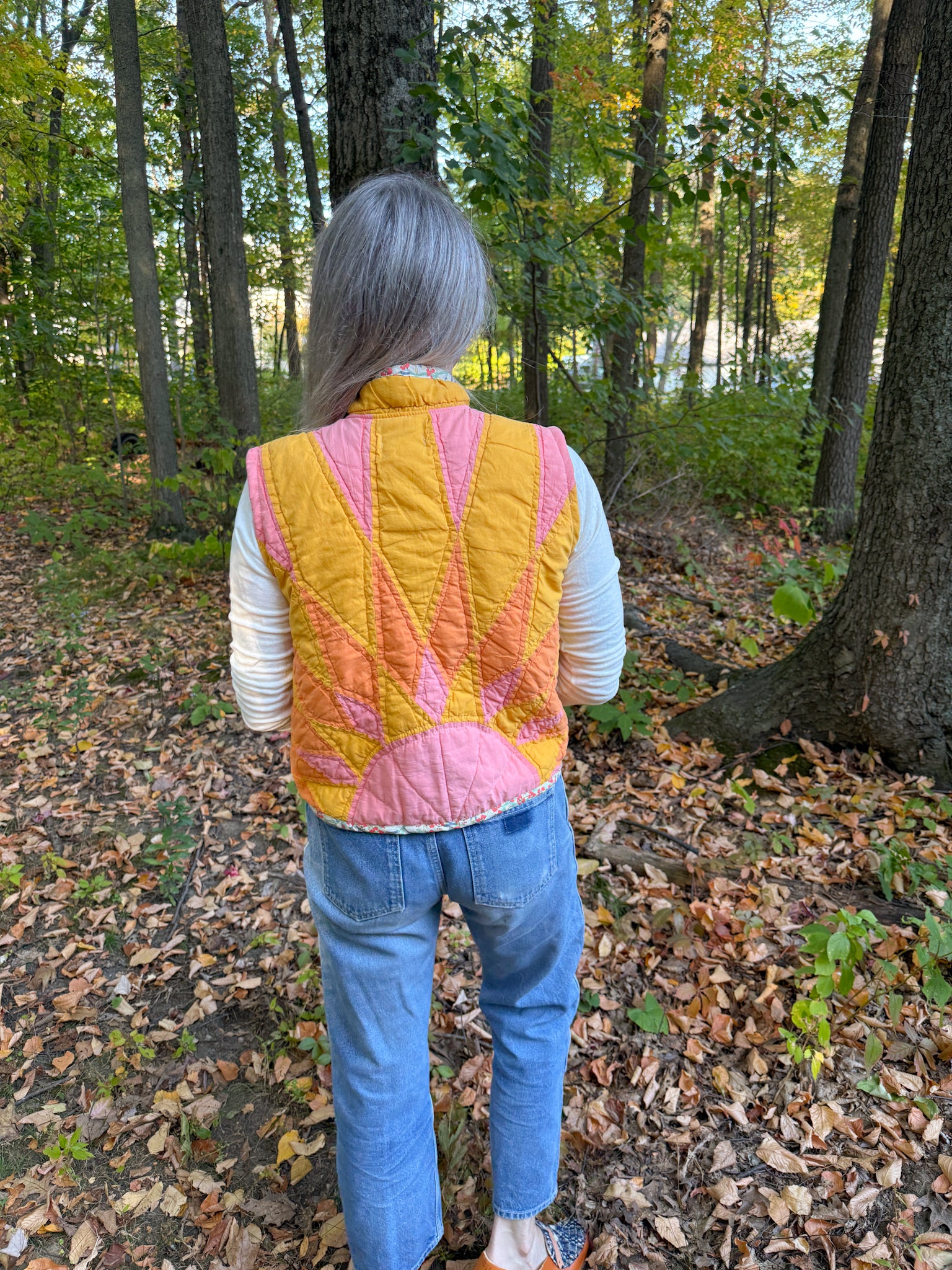 This vest is made from a lightweight quilt that is hand-pieced and quilted in a Sunburst pattern with coral pink, yellow, and orange cotton fabrics, and poly-fil batting. The outer edge and rounded patch front pockets are bound in a cheery floral cotton fabric.