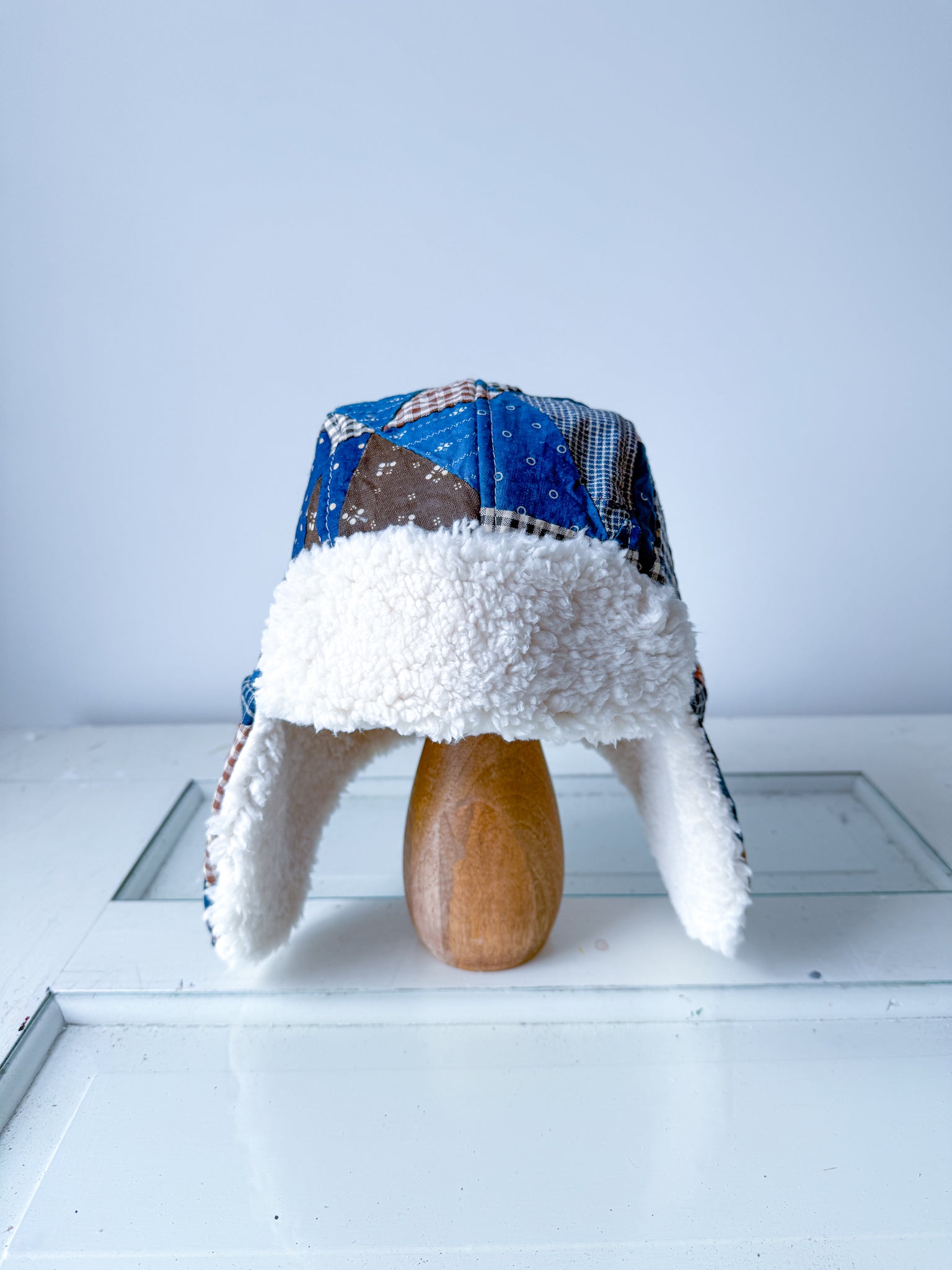 A supremely cozy take on the classic Aviator Hat! Quilt on the outside and sherpa on the inside for maximum warmth all winter long! Fits an average adult-sized head with plenty of squish and sizing flexibility.