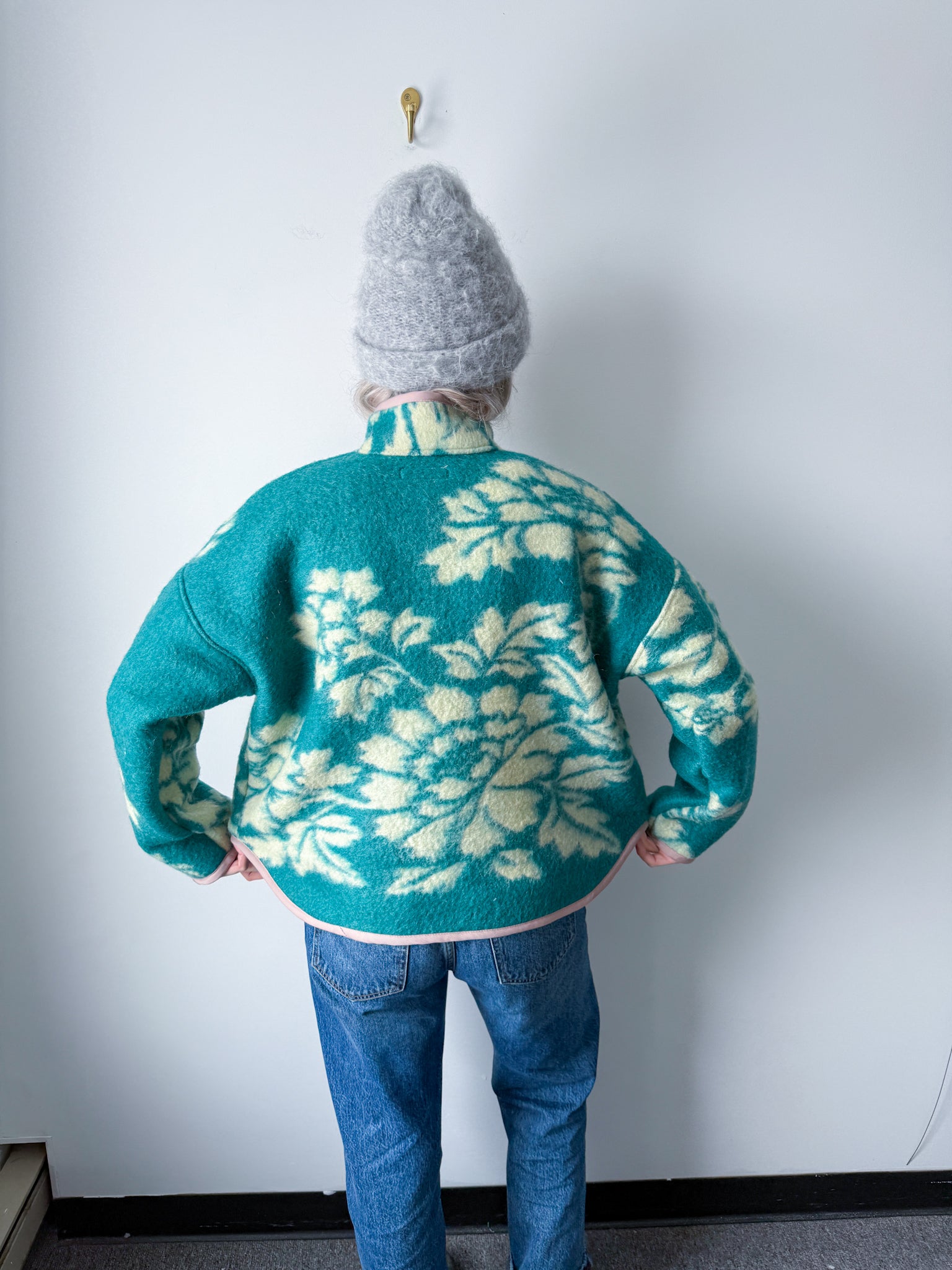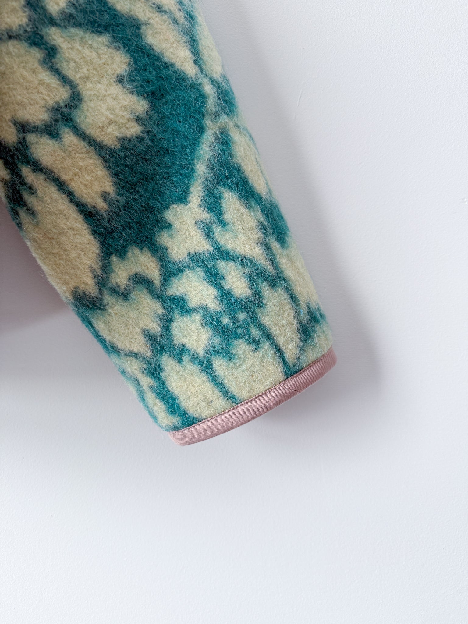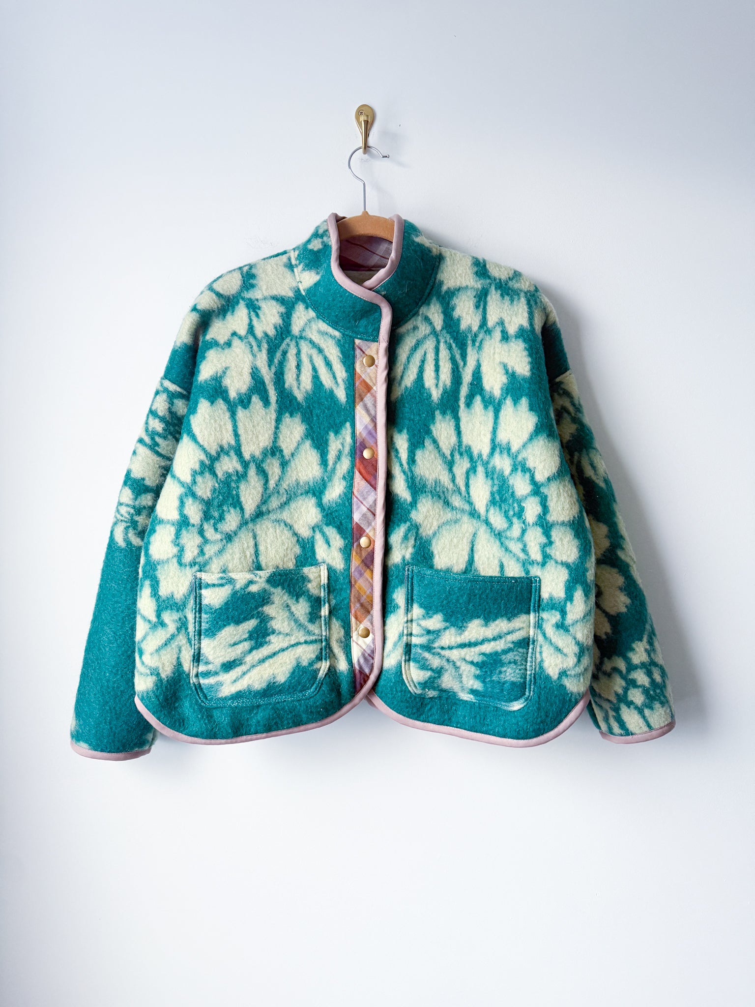 This Flora Jacket is made from a vintage wool blanket sourced from Ukraine in a stunning turquoise! The front plackets and inner collar are pieced from a twill cotton plaid sample fabric from our friends at Toad&Co, with the outer edges and pockets bound in dusty lilac tencel fabric from a local woman-owned fabric shop here in Vermont.