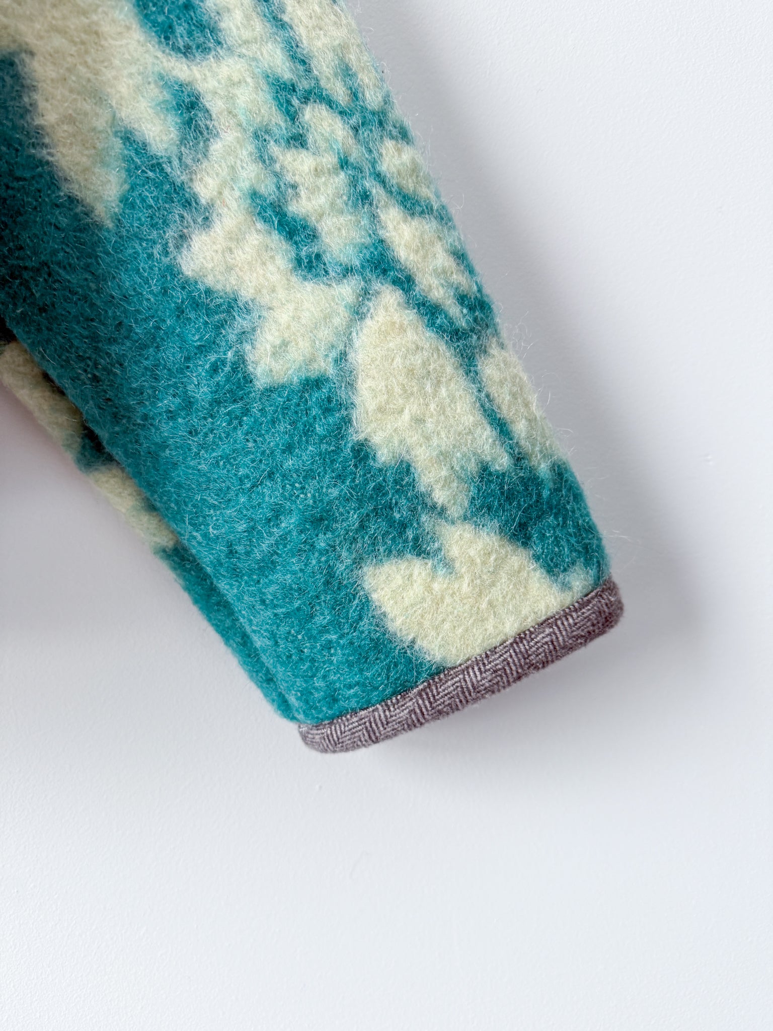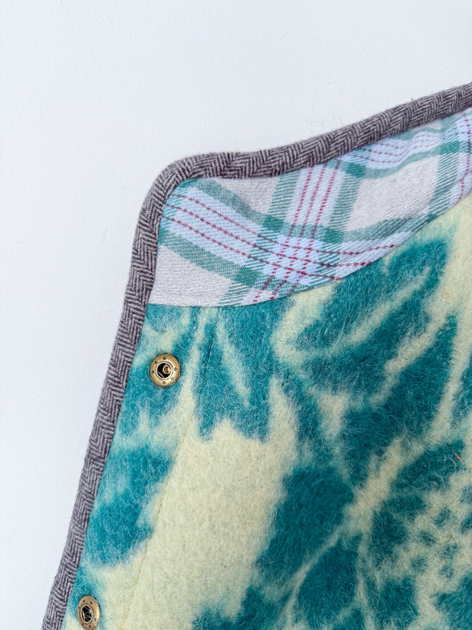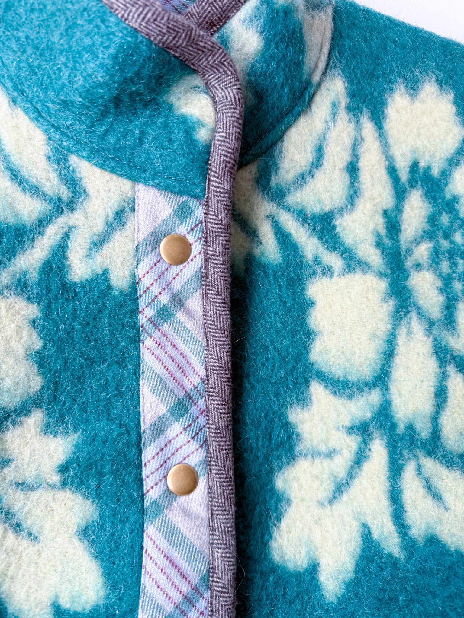 This Flora Jacket is made from a vintage wool blanket sourced from Ukraine in a stunning turquoise! The front plackets and inner collar are pieced from a cozy flannel plaid sample fabric from our friends at Toad&Co, with the outer edges and pockets bound in an equally cozy herringbone flannel.