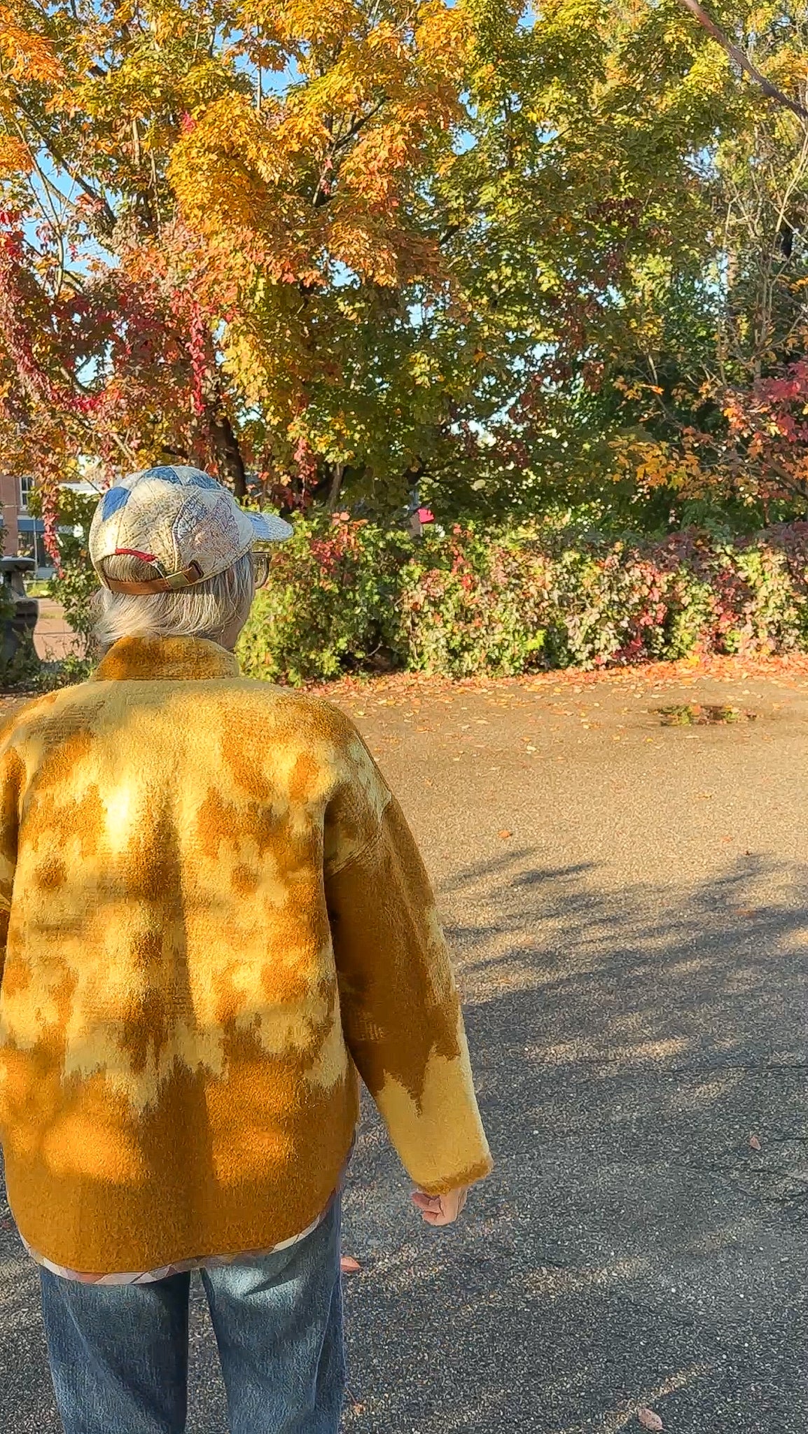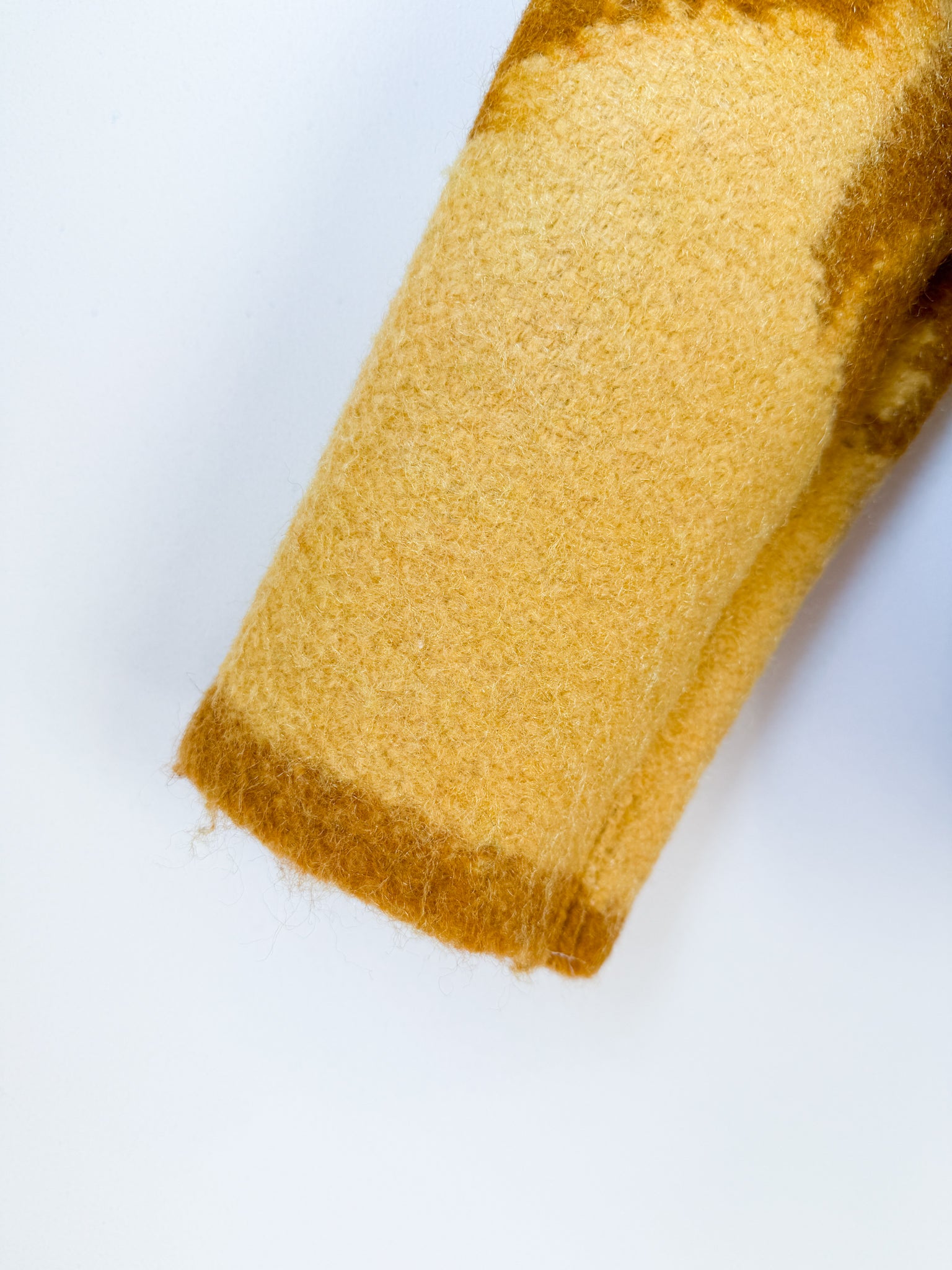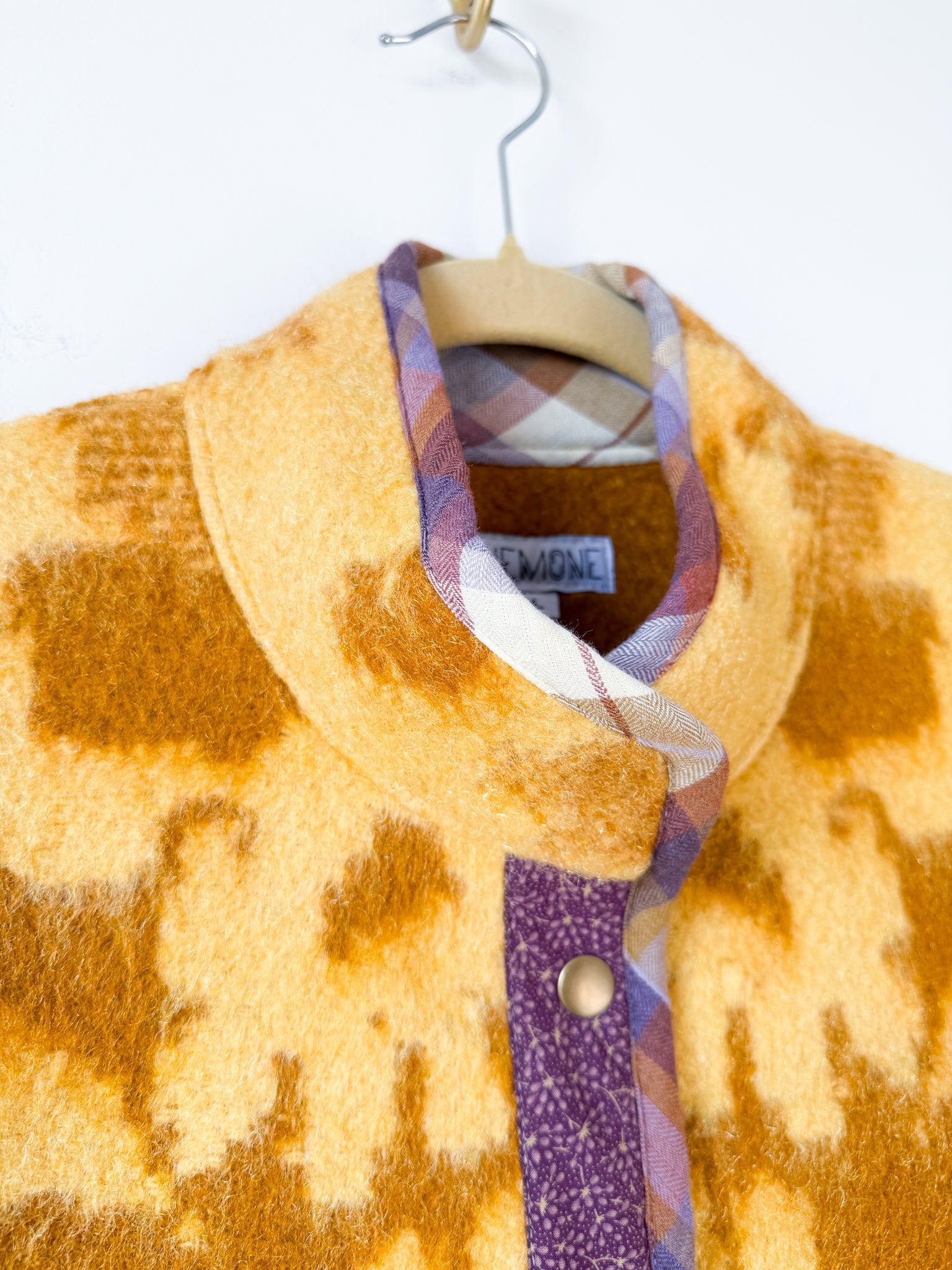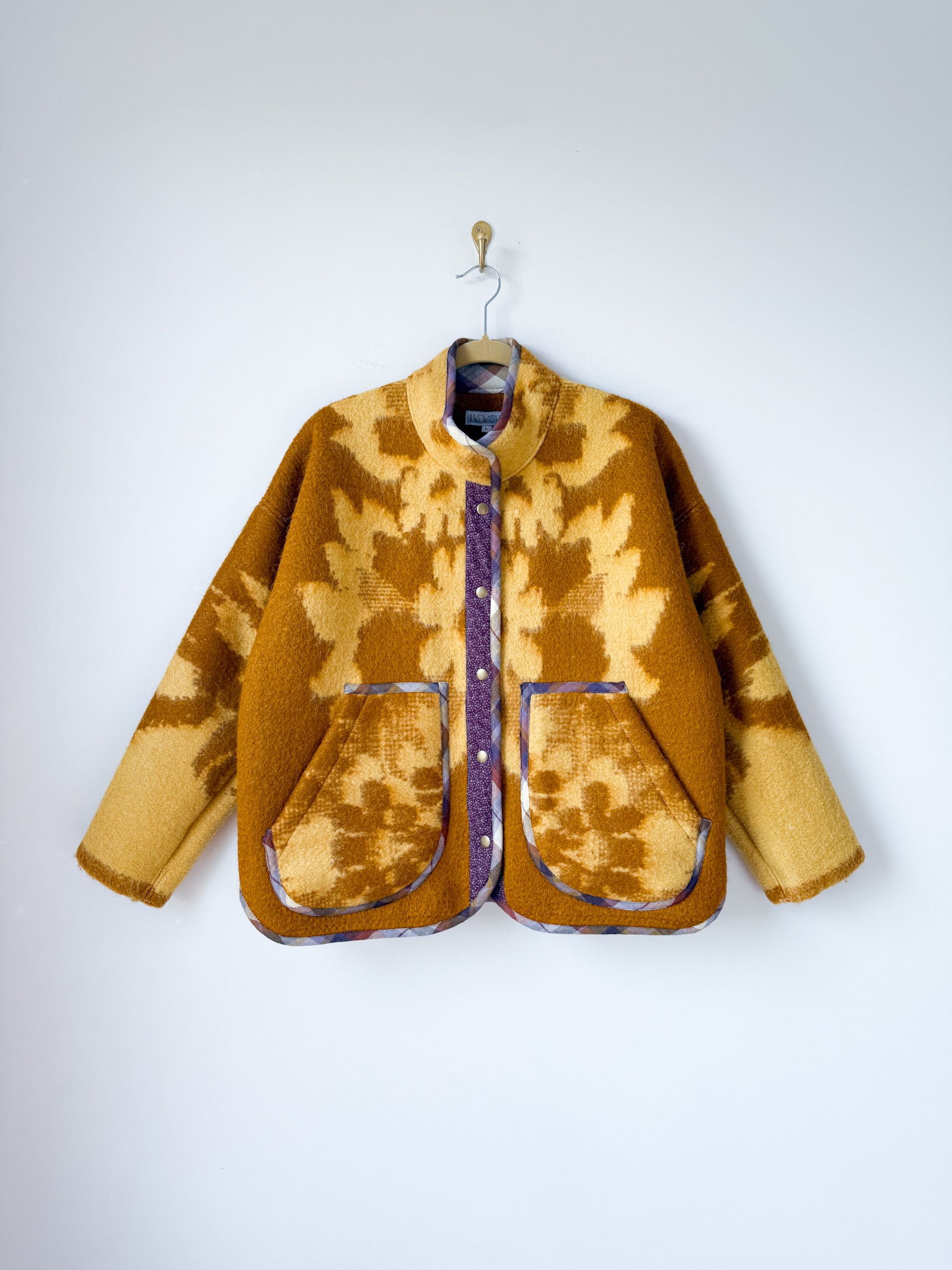 This Flora Jacket is made from a vintage blanket sourced from Ukraine, in a beautiful goldenrod color with contrast floral pattern. The collar lining and outer edges, pockets, and sleeves are bound in a lightweight cotton plaid (sample fabric from Toad&Co.!). The front placket is made from a plum colored print cotton.
