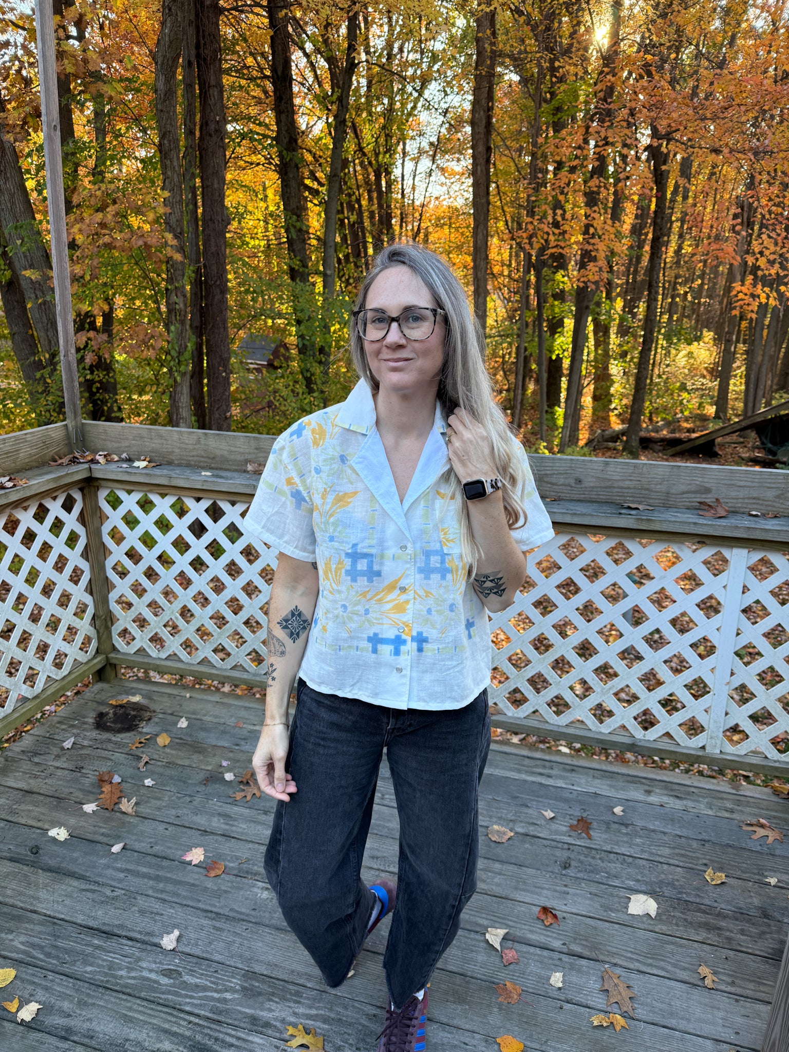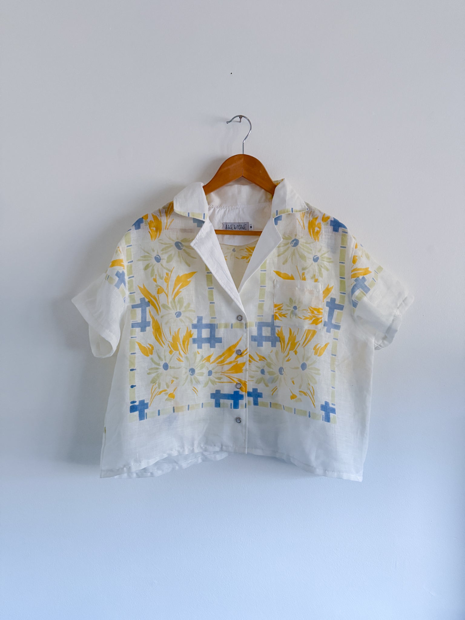 This short sleeved (but not too short to cuff, if that’s your jam) shirt features a vintage floral tablecloth that is lightweight linen - it is not fully opaque. It has pearl snap closures, an open collar, and boxy fit.