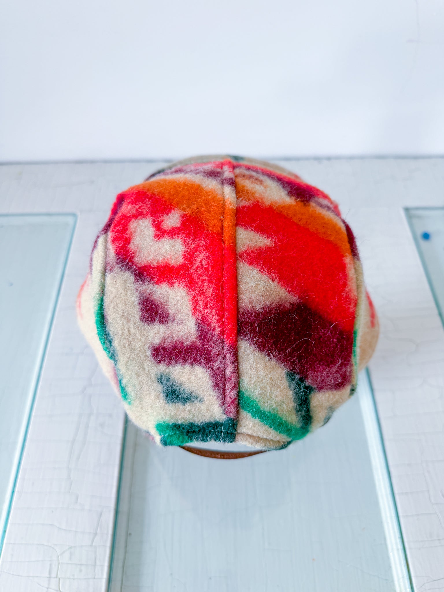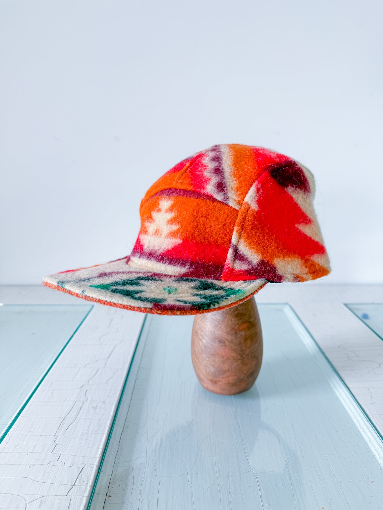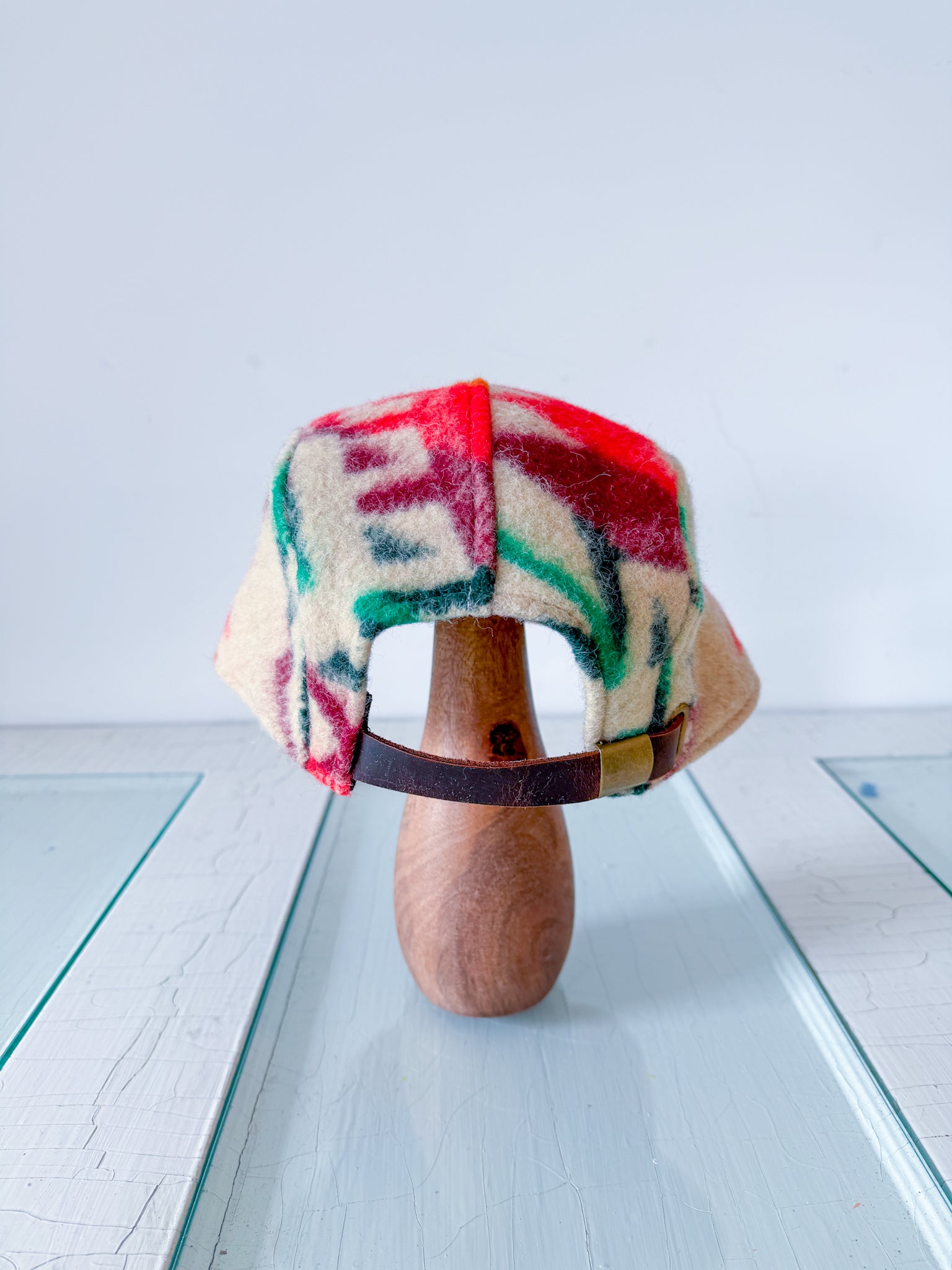 This 5 Panel Hat features a deadstock vintage blanket purchased from a woman-owned business in Ukraine. It is soft and cozy, and has a pattern reminiscent of the mid to southwestern US (with strong Pendleton vibes!) These hats feature a traditional plastic brim insert (that can be shaped if desired), sweatband inside, antique brass hardware, and an adjustable leather strap in the back. This is the LARGER size - the body of the hat measures approximately 21.25" in circumference, not including the leather strap. It is approximately 7.5" from side edge to top of the crown (depth measurement). This comfortably fits my husband with a 24" head, and is flexible in either direction due to adjustability.